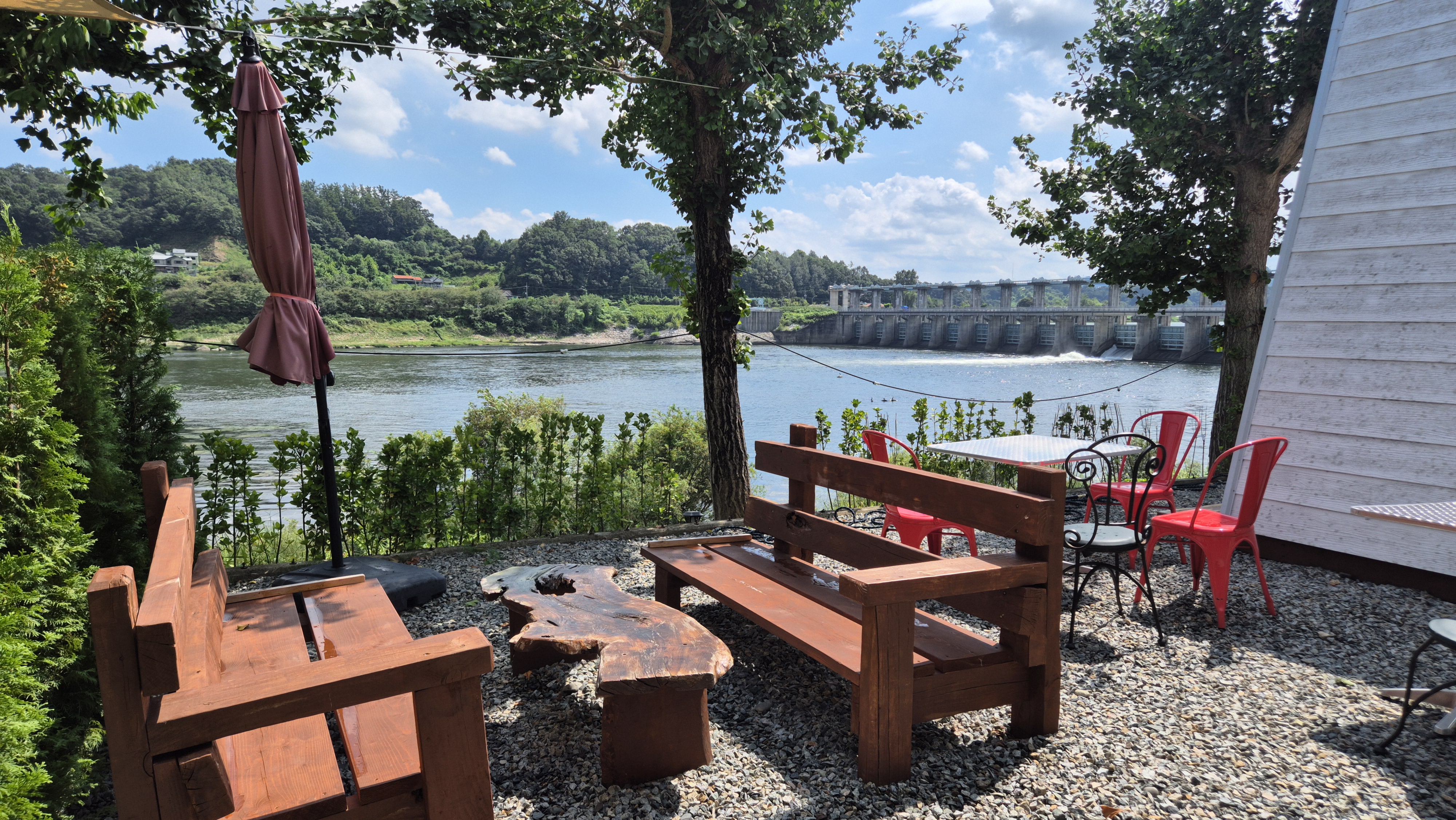실내와 실외의 뷰가 남한강과 조정지댐 방류를 보게 되는 관점이라