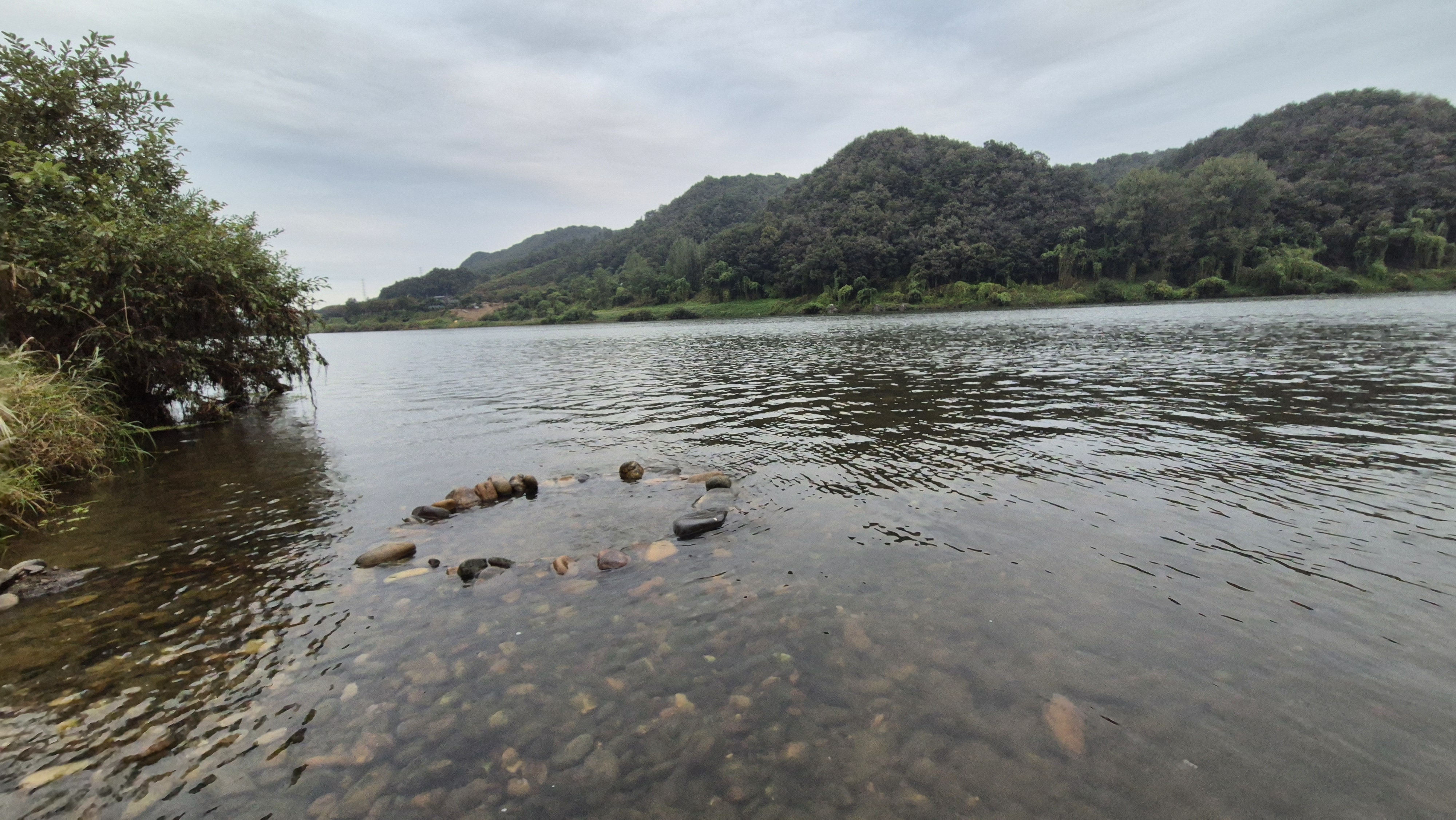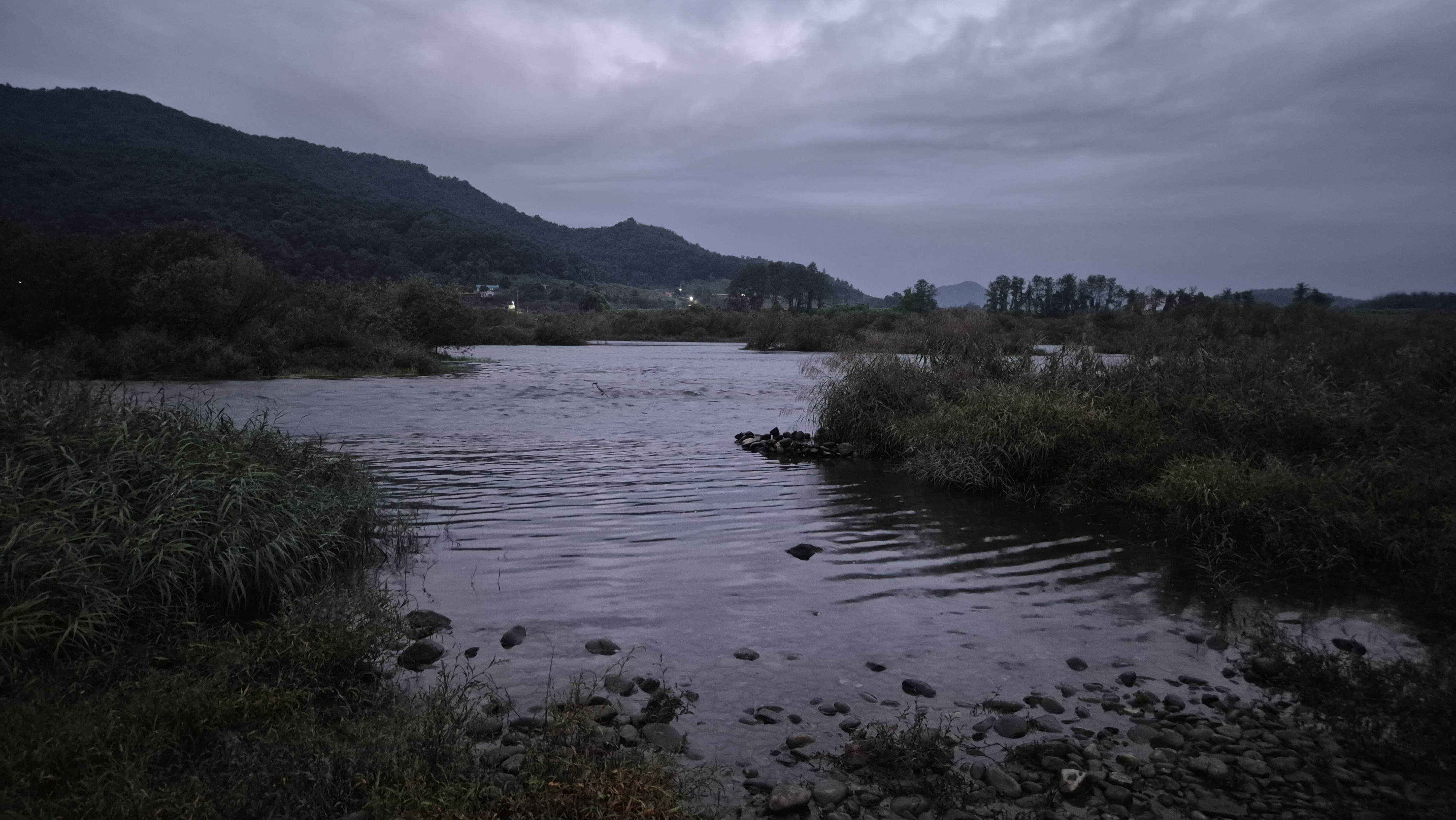 여울 건너편의 산에 아직 마름이 많지는 않다.